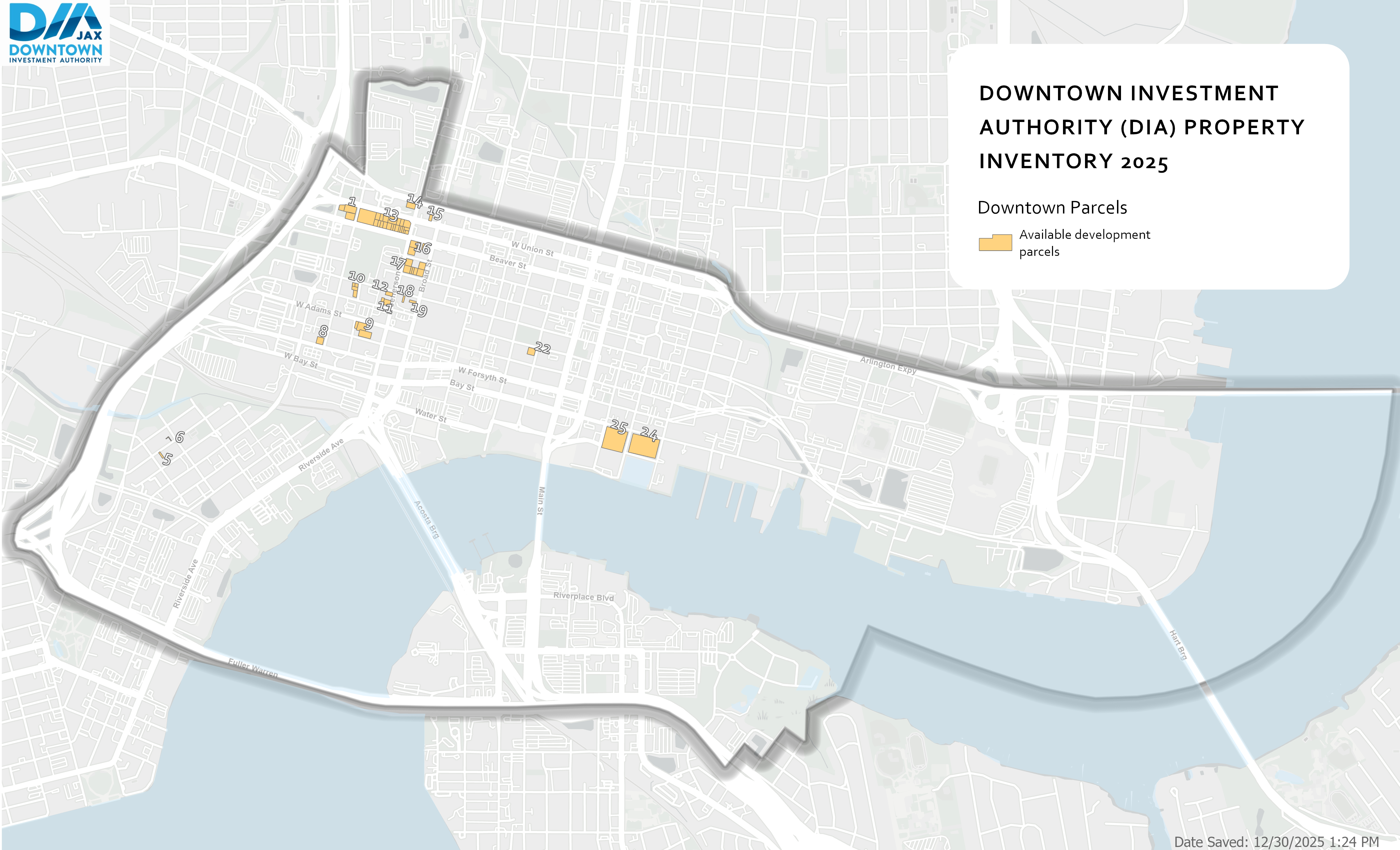 This inventory includes only City-owned parcels located within the DIA boundaries of Downtown Jacksonville and is not a comprehensive listing of all City-owned property citywide.