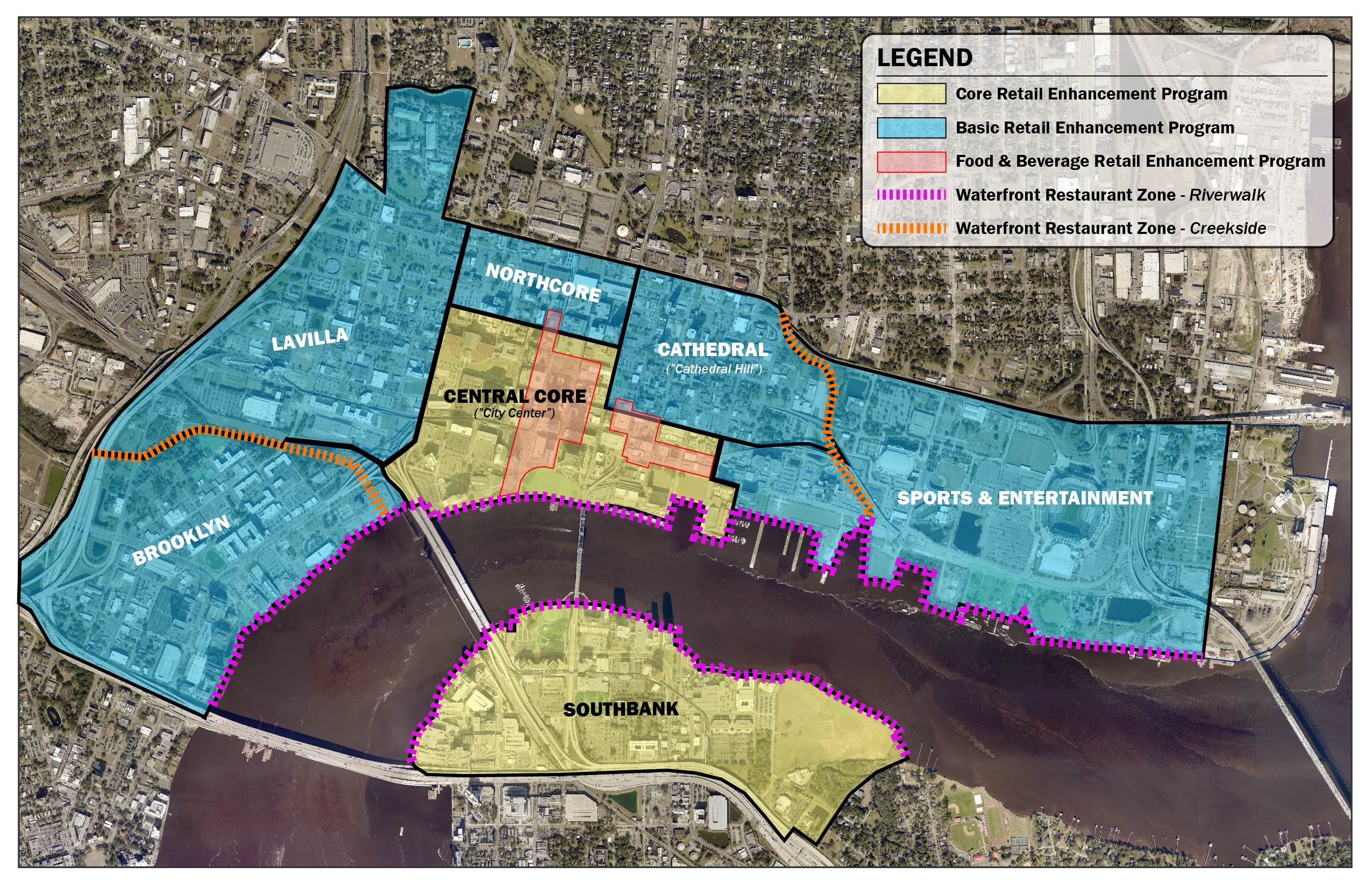 All Retail Enhancement programs will be structured as grants with clawbacks subject to maintaining performance requirements during a defined compliance period but are often interchangeably referred to as Forgivable Loans. To streamline documentation, DIA has chosen to eliminate Loan agreements and recorded security instruments in favor of grant agreements with applicable clawback language. All eligible properties are located within the boundaries of either the Northbank or Southside CRA (the “Retail Program Areas”). As such, individual awards will be funded from the Retail Enhancement Program funding of the applicable CRA or from the available Forgivable Loan or Retail Enhancement Program funding within the Downtown Economic Development Fund.
